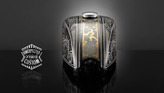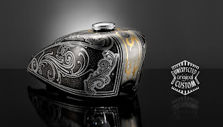 Serbatoio custom/chopper ricoperto con tre strati metal flake in diverse grane. Aerografato con colori opachi, "kandy" e "sparkle". Lavorazione antichizzata per i dettagli in foglia d'oro 24 carati. |