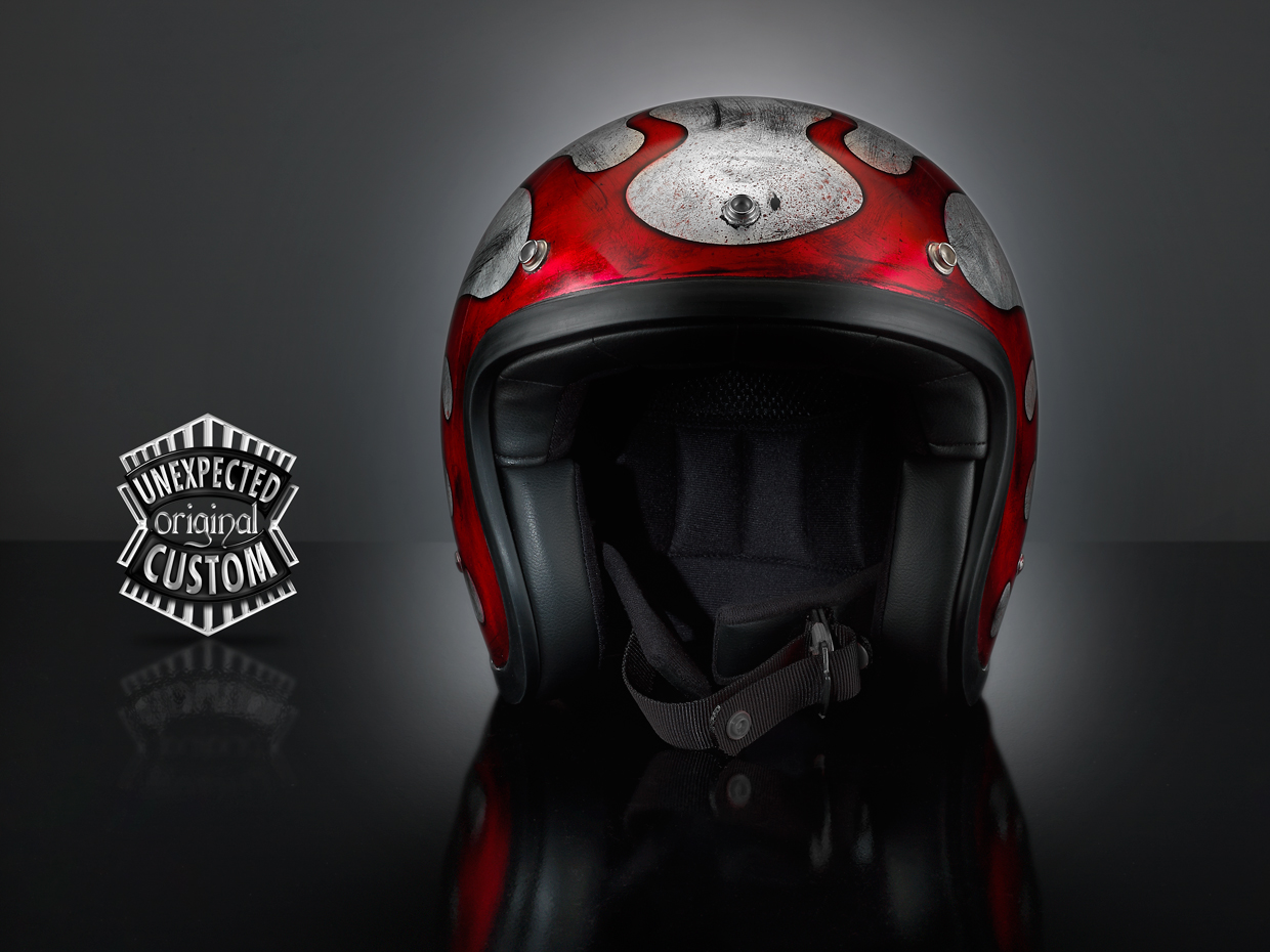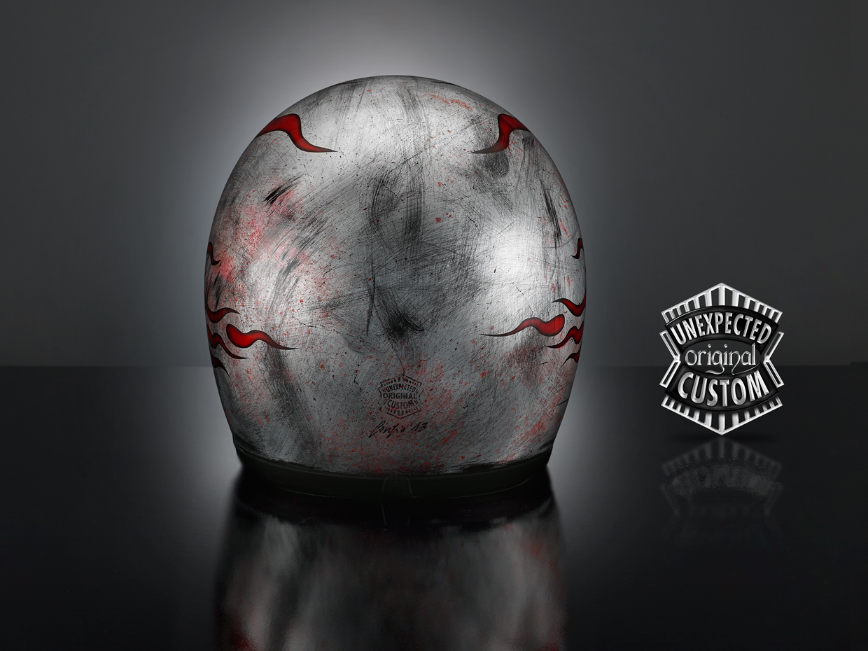Casco dal design semplice ma aggressivo. Ricoperto in foglia d'argento e lavorato con una tecnica speciale che simula l'effetto della vecchia lamiera di ferro arrugginita. Le fiamme sono realizzate con colori per vetrata e lasciano trasparire l'effetto "grunge" del metallo rovinato. |